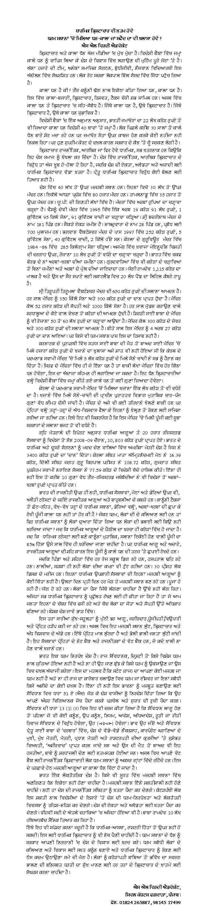ਧਾਰਮਿਕ ਭ੍ਰਿਸ਼ਟਾਚਾਰ ਵੀ ਖਤਮ ਹੋਵੇ